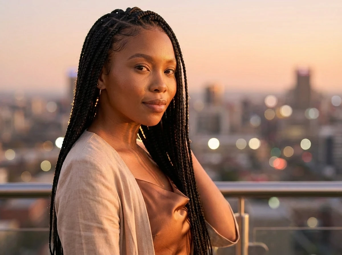 Knotless braids fall softly from the root. The parting is clean, the outline is gentle around the face, and the style moves easily through your day.
